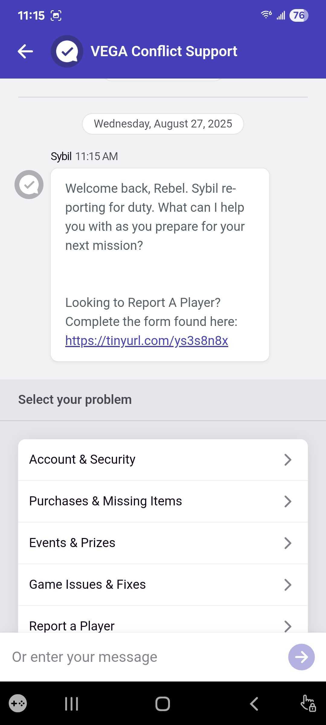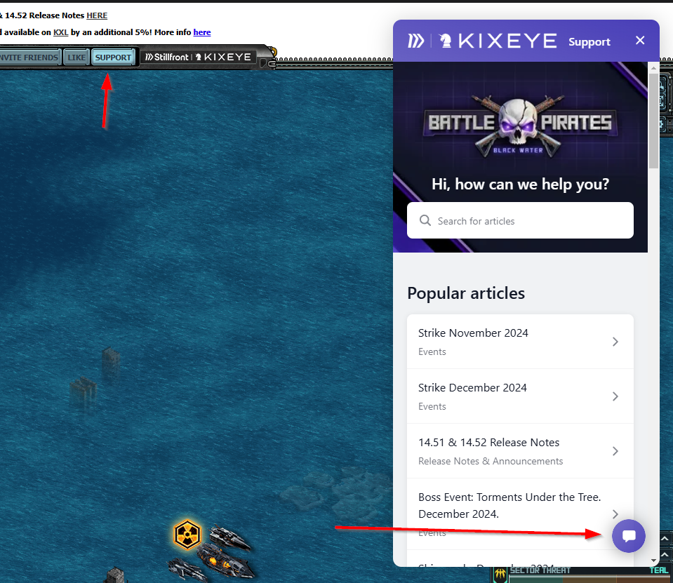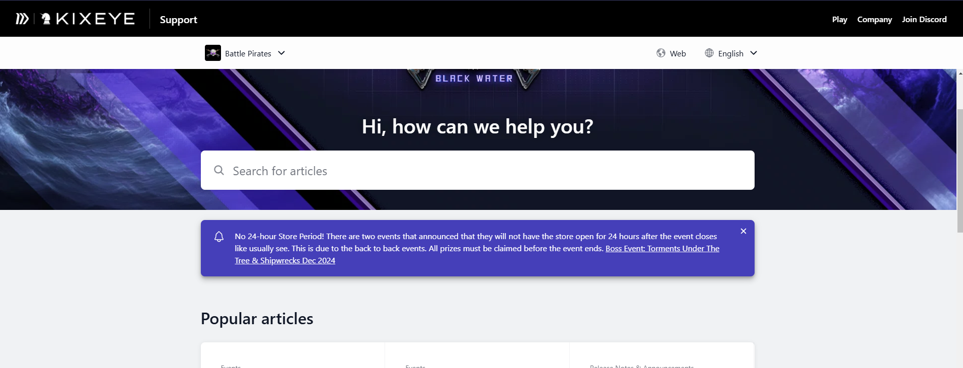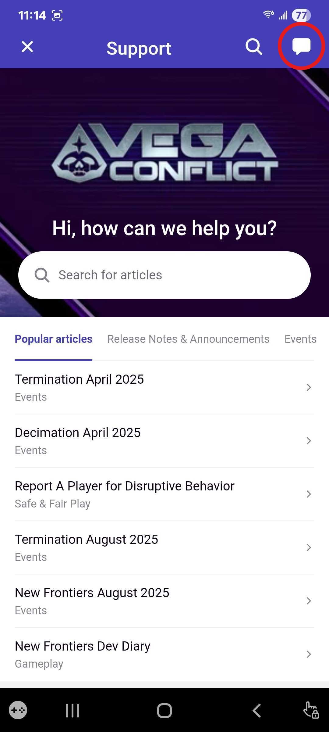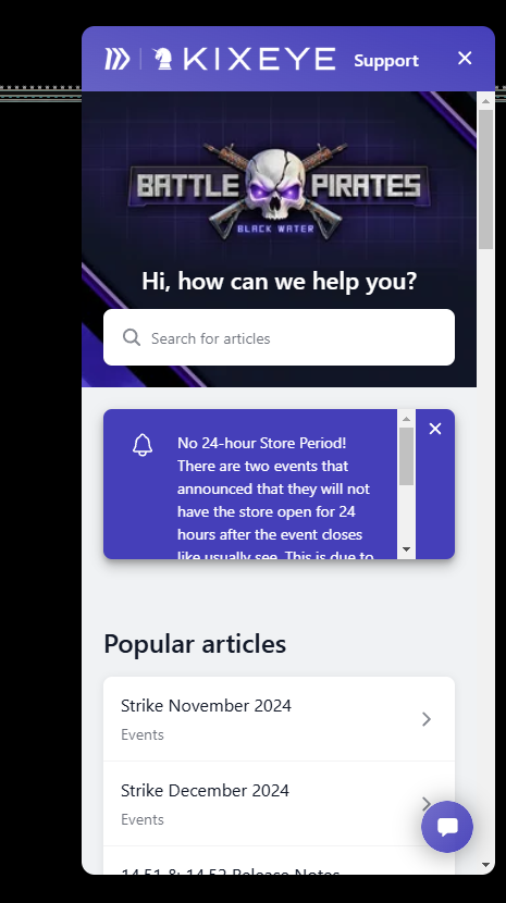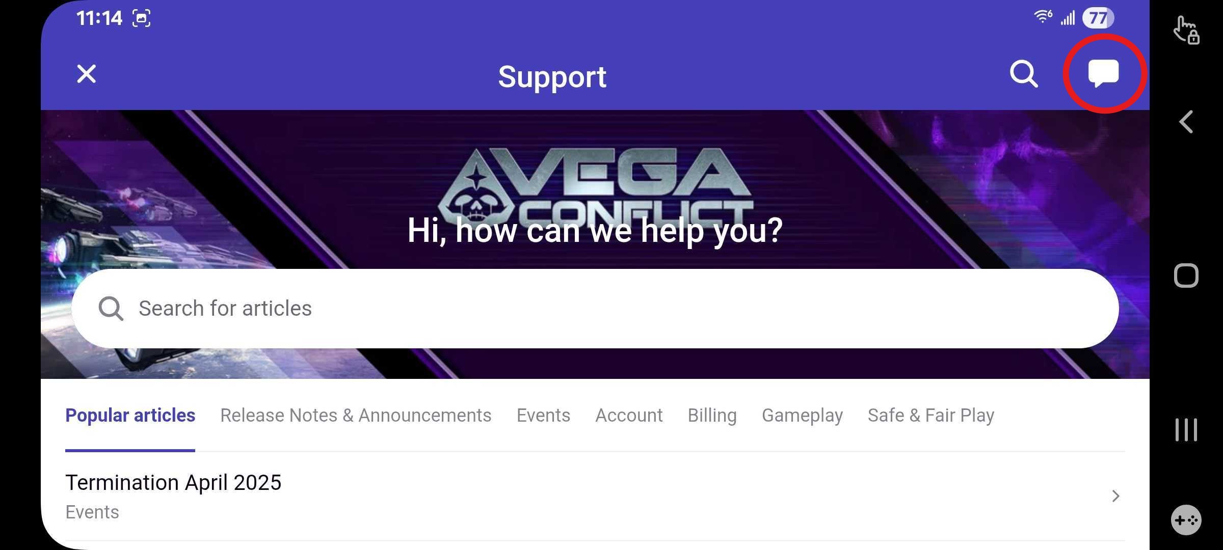3. The help center will open. Search for articles, event briefs, and gameplay information. If you need assistance, click on the chat icon in the upper right corner.