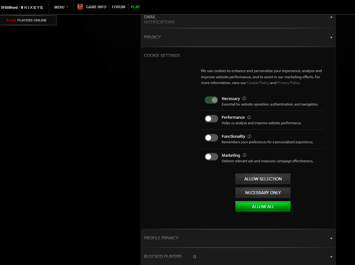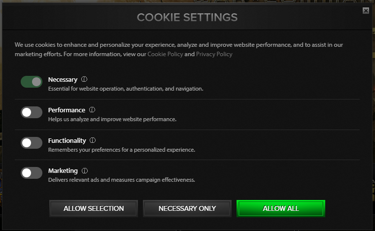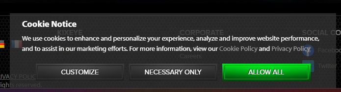 Starting today, when you visit KIXEYE.com you may notice a pop-up asking you to allow cookies. This was previously an automatic process but now requires you to choose either Necessary Only, Allow All, or a custom combination. This is not a security breach or anything invasive to your device. This is a normal process for nearly all websites these days.